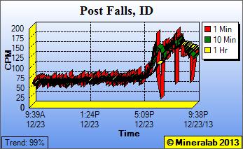 Update: 12/27/13, 7:40 A.M. - Station operator took himself offline to conduct some specific tests in the last couple of days. Most everything he scanned for 10 minutes each read pretty normally - kitchen wood/formica counter at 61 CPM, shoes at 71 CPM, another rainfall test (paper towel swipe of car) at 62 CPM. But here is the very telling experiment - a 10 minute outdoor background count 20" off the ground which read at 61 CPM - close to normal background for his high count rate pancake-tubed Geiger counter at his 2,300' altitude. This test was necessary to remove the Geiger counter completely from any specific substance and/or indoor environment that may have contributed to his continuous 100+ CPM readings on 12/23, and assure that the Geiger counter itself was not contaminated. But here is the next interesting part - after the above tests, he plugged his detector back into his computer for a logged and continuous monitoring again from indoors, and after many hours, he reports his graph showed the same elevating pattern, peaking at a sustained level above 100 CPM. So this most likely points to a radon gas infested environment indoors, as opposed to a passing radioactive weather pattern. I would add that he monitors from a one story house with basement, where the two sections are connected via a door-less doorway. To confirm the radon theory, the plan is to ventilate the kitchen from where he is monitoring, confirm readings subsided to normal, then close up the house, and plug back into the network so we can remotely watch if his graph re-elevates over a period of time again. So stay tuned. Follow up: 12/24/13, 8:10 A.M. - Spoke with the station operator this morning. He states that the rainwater scan was conducted independent of these elevated readings, so we are still investigating the cause. We want to rule out possible explanations like a contaminated instrument, a contaminated operator, or a local indoor radioactive environment, so station operator will do a timed background count outdoors later today. Until then, he took his station offline. Hopefully, his outdoor count will reveal his normal background for the pancake-tubed PRM-9000 at his 2,300' altitude of about 55 CPM. If not, we'll need to consider either the contamination explanations, or a radioactive environment that moved into his area.