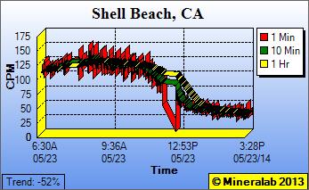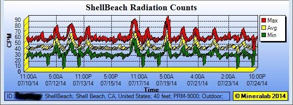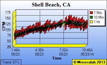Latest: 5/30/14, 9:45 A.M. - After a 4 to 5 day interval of subsided readings, Shell Beach has returned to sustained elevated readings above 100 CPM, and issuing Radiation Alerts. The PRM-9000 was relocated to a new apartment in the same complex, next to an open window to rule out possible detection from any radon accumulation inside the apartment, and away from any stone countertop or collecting air filter. Station operator had submitted documentation of earlier elevated readings to nearby Diablo Canyon nuclear power plant, but no response yet. Action items for next week: