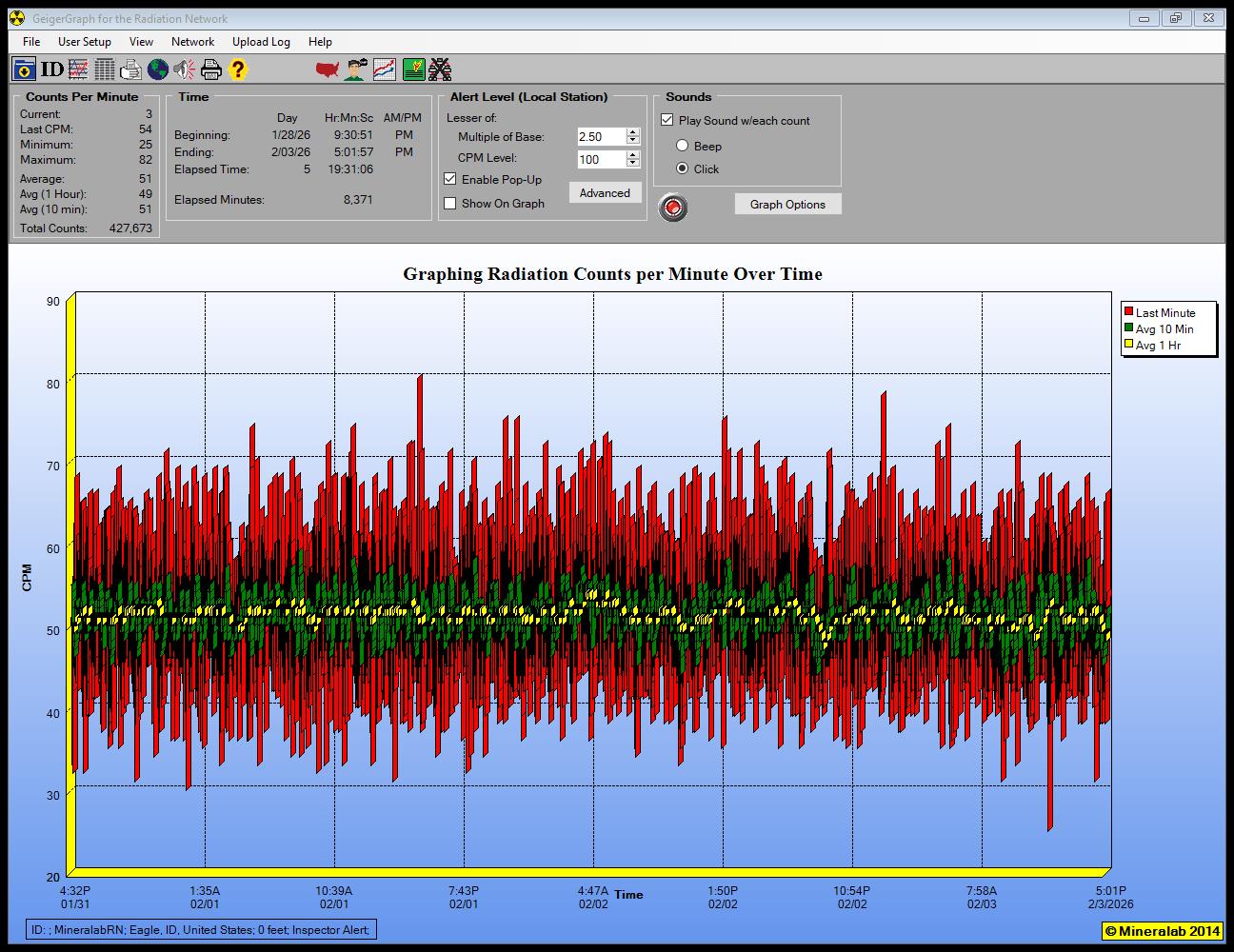 This is my real time Graph, from Mineralab in Prescott, Arizona. You can watch it update once per minute - your browser will automatically refresh. In addition to the graph itself changing over time, you will note updates in both the Counts Per Minute and Time sections.