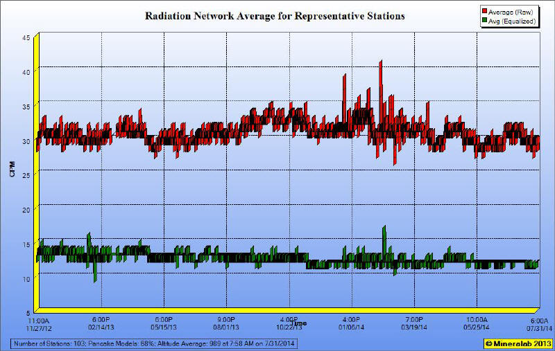 *Readings not Equalized means the Monitoring Stations are broadcasting the raw radiation count from their Geiger counters, without adjustment for different count rates existing between various Geiger counter designs. For instance, models built around a "Pancake" style of Geiger-Mueller tube typically have about a 3 times count rate over Standard tubed models, so their readings in CPM would be expected to average about 3 times higher, anyway.